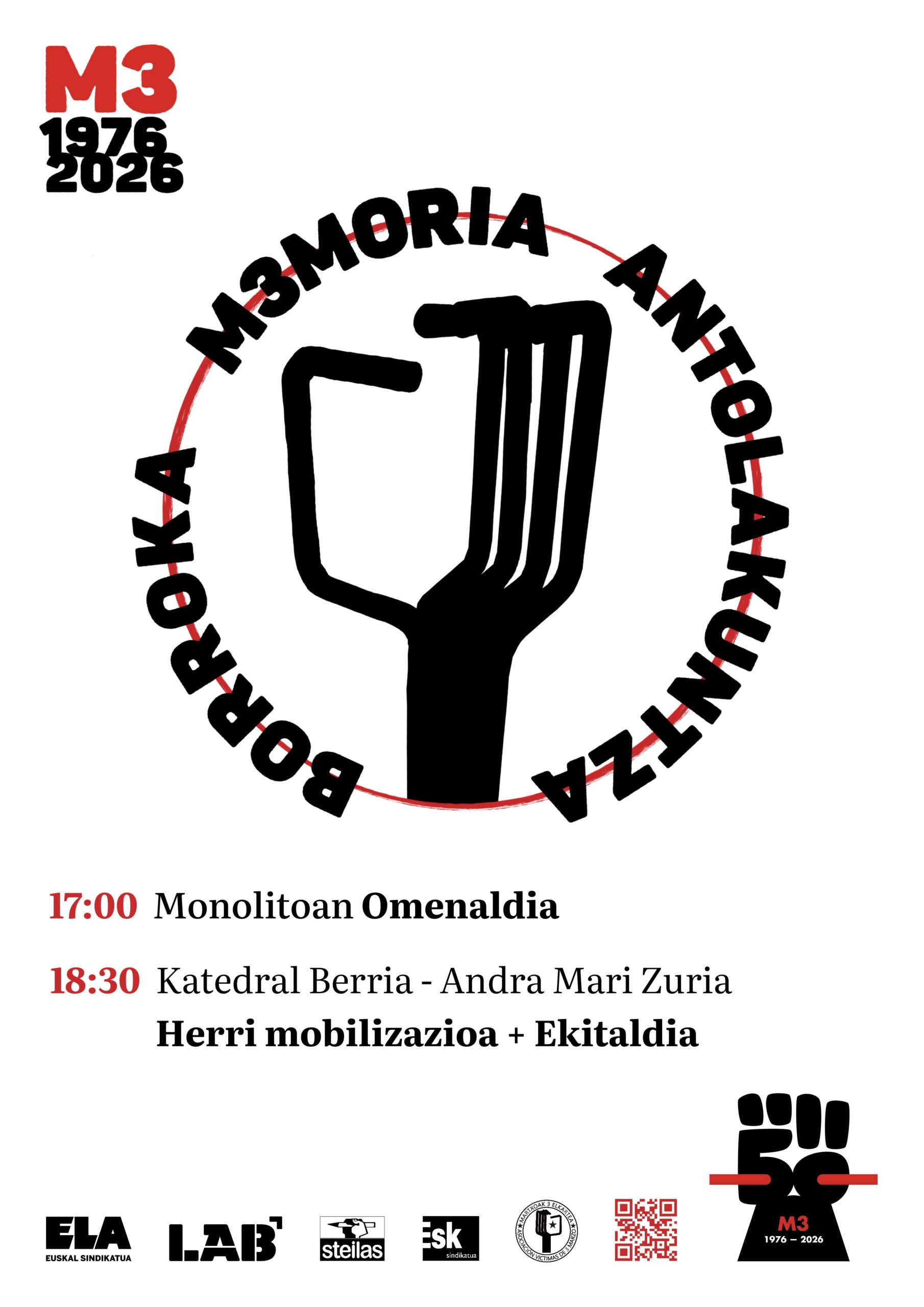 Se cumplen 50 años del 3 de marzo de 1976, un día para el recuerdo y el homenaje a los cinco trabajadores asesinados por la policía en la capital alavesa y los dos jóvenes que salieron a protestar y cayeron víctimas de la represión policial en Basauri, y en Tarragona. Este año, una vez más, Martxoak 3 elkartea – Asociación Víctimas 3 de Marzo y los sindicatos ELA, LAB, ESK y STEILAS, recordaremos a todas las personas que sufrieron la violencia del Estado y pondremos en valor a la clase trabajadora que protagonizó un proceso de movilización y organización colectiva por salarios y condiciones dignas, ahogado con brutal represión. Queremos poner en valor también la labor de todas esas mujeres que contribuyeron a socializar las razones y a sostener económicamente los efectos de las huelgas. Medio siglo después, seguimos exigiendo verdad, justicia, reparación y garantías de no repetición. Hoy, como en 1976, reivindicamos la lucha de la clase trabajadora por la justicia social y contra un sistema capitalista profundamente injusto que impulsa la privatización de los servicios básicos, debilitando lo público y profundizando en un modelo que prioriza el beneficio económico frente a los derechos sociales y que sigue acumulando la riqueza en unas pocas manos a costa de la explotación de las personas y del planeta. Eso hace que estemos inmersos e inmersas en un escenario internacional marcado por profundas tensiones globales que afectan a pueblos y clases trabajadoras en todo el mundo, en Euskal Herria denunciamos estas violencias y expresamos nuestra solidaridad con los pueblos que resisten y se organizan por su dignidad. El genocidio en Palestina es una crueldad sostenida y sistemática, una masacre de un pueblo entero a manos del Estado israelí. Es violencia de Estado contra trabajadores y trabajadoras, niños y niñas, contra quienes resisten. La ocupación, el apartheid y la limpieza étnica son crímenes de guerra, y el silencio internacional los legitima. También denunciamos la agresión perpetrada por Estados Unidos contra Venezuela, una operación imperialista con el objetivo explícito de controlar y expoliar los recursos naturales venezolanos. Este 3 de Marzo se inscribe además en un ciclo de movilización amplio y necesario, que le seguirá el 8 de Marzo, jornada de lucha feminista, que saldrá a la calle un año más para denunciar cómo el sistema capitalista, patriarcal y colonial precariza la vida de las mujeres y más aún la de las mujeres racializadas y personas disidentes de la cisheteronorma. Un mes de Marzo especialmente marcado por la Huelga general del 17 de marzo, convocada para exigir un Salario Mínimo Interprofesional propio, para exigir, como en 1976, salarios mínimos dignos para todas las personas trabajadoras y un reparto más justo de la riqueza. Como entonces, nadie nos va a regalar nada, así, los Gobiernos y patronales de Hego Euskal Herria han demostrado su posicionamiento conjunto en defensa de los privilegios de unos pocos sobre la mejora de las condiciones de vida de las personas que sufren la precariedad laboral más extrema. El Gobierno Vasco ha mostrado su cara más antidemocrática al no admitir a debate la Iniciativa Legislativa Popular por un SMI propio, respaldada por más de 140.000 firmas de la ciudadanía, así como la impulsada por el Movimiento Pensionista para que las pensiones mínimas sean iguales al SMI. Se cumplen 8 años desde que quienes protagonizaron las luchas obreras de 1976 salen cada lunes a las calles exigiendo pensiones dignas. En esta Huelga general queremos denunciar la pérdida del poder adquisitivo de toda la clase trabajadora, con unos salarios, pensiones y prestaciones sociales que se actualizan por debajo del aumento de la carestía de la vida. Queremos denunciar el aumento insostenible de las desigualdades sociales y las brechas machistas y racistas que se mantiene en los salarios y las pensiones, más dolorosa aún para las mujeres pensionistas y las mujeres racializadas que a menudo sostienen la vida con economías sumergidas y sufriendo la injusta ley de extranjería. Todas son cuestiones centrales que esta huelga responde con claridad política. En ese contexto, en este 50 aniversario del 3 de Marzo reafirmamos que la memoria histórica es también una herramienta de lucha para enfrentar la desigualdad, la violencia y la injusticia en todos los rincones del mundo. Por todo lo anterior, este año el lema elegido es “M3moria. Antolakuntza. Borroka”.M3moria para exigir Verdad, Justicia, Reparación y garantías de No Repetición. Organización para construir fuerza colectiva. Lucha para conquistar derechos. Para esta jornada del 50 aniversario del 3 de Marzo estamos organizando un doble acto que estará a la altura de este 50 aniversario, y que supondrá un hito en la memoria colectiva, para recordar a las personas asesinadas y las luchas de aquellos momentos, pero también las de todos estos años, con el objetivo de proyectar esa necesidad de lucha también hacia el presente y el futuro, como forma de avanzar hacia una sociedad más justa. Para ello, habrá dos eventos: A las 17h, tendrá lugar el Homenaje a los asesinados junto al Monolito del 3 de Marzo, justo a la hora en que tuvo lugar aquella Asamblea de 1976 que reventó la Policía Armada. En este homenaje tendrán una presencia especial aquellos trabajadores que pusieron el monolito y su placa, para recordar que hoy existe gracias a su tesón, ya que aunque ahora todas las instituciones se sacan la foto en él, fue repetidamente retirado y posteriormente sufrió el mismo olvido institucional que tuvieron las víctimas. Más tarde, a las 18:30h tendremos otra cita en la que ocuparemos el espacio entre la Catedral Nueva y la Plaza de la Virgen Blanca. En la Catedral queremos recordar los funerales de aquel 1976, y marcharemos en una gran movilización popular hasta la Plaza de la Virgen Blanca donde tendrá lugar un gran acto central