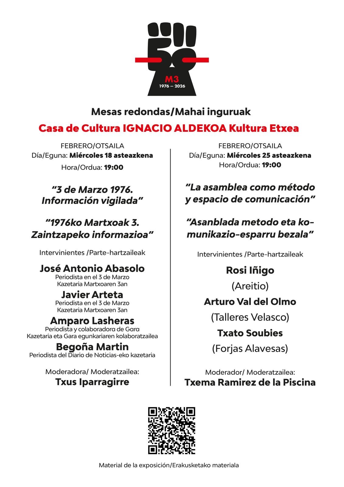 Bajo el título “Komunikazioa eta memoria. Prensa y masacre: una mirada crítica”, la Asociación 3 de marzo inauguró ayer una exposición en la Casa de Cultura Ignacio Aldecoa de Vitoria-Gasteiz. La muestra se podrá visitar durante seis semanas hasta el 31 de marzo, en el horario habitual de la Casa de Cultura (de lunes a viernes, de 9:00 a 14:00 y de 16:00 a 20:00 y los sábados, de 9:00 a 13:30). La exposición se enmarca dentro de los actos conmemorativos del 50 aniversario de la masacre. La iniciativa es fruto de la colaboración que durante los últimos seis meses han llevado a cabo responsables de la entidad organizadora y profesionales locales del ámbito de la comunicación. El objetivo es claro: recordar a las generaciones actuales la memoria de una masacre que ha marcado la historia de la ciudad. La muestra se centra en el ámbito de la comunicación y, más en concreto, en las portadas que en torno al 3 de Marzo publicaron los principales periódicos editados dentro y fuera de Euskal Herria. La colección está organizada en cuatro bloques: prensa editada en Euskal Herria, prensa publicada en el estado español, publicaciones al margen del poder y prensa internacional. La muestra exhibe un total de 25 portadas. En cuanto a la parte gráfica, la colección se completa con varias instantáneas emblemáticas realizadas en aquella época por el fotógrafo gasteiztarra Luis Ziarrusta. La muestra se culmina con un breve audiovisual. Además, en varias vitrinas se exhibe una colección de revistas, objetos, libros, noticias falsas y reflexiones de interés sobre estos sucesos. Todos los miércoles habrá visitas guiadas a la exposición. Serán en euskera y castellano y como máximo para 15 personas. Para ello será necesario inscribirse previamente en esta página: https://docs.google.com/forms/d/e/1FAIpQLScX3wlkoreip1INsbGA8t_Thu7oII0MP0piW5Y-UOxiMrsgeg/viewform Junto a la exposición habrá dos mesas redondas los días 18 y 25 de febrero a las 19.00. En la primera, periodistas de entonces compartirán sus experiencias con informadores en activo. En la segunda, tres trabajadores en huelga hace 50 años debatirán sobre el valor socializante y comunicativo de la asamblea. KOMUNIKAZIOA ETA MEMORIA. PRENSA Y MASACRE: MIRADA CRITICA ver expo virtual aquí: https://sites.google.com/view/komunikazioa-eta-m3moria/erakusketa-exposici%C3%B3n www.martxoak3.org Navegación de entradas M3moria. Antolakuntza. Borroka.