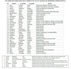Se cumplen 50 años de la masacre del 3 de Marzo, un crimen perpetrado 100 días después de la muerte de Franco. El dictador murió hace más de medio siglo, pero el franquismo dejó todo “atado y bien atado” y la violencia de Estado se continuó practicando sistemáticamente. “Somos víctimas de ese franquismo sin Franco, denunciamos el insoportable modelo de impunidad español y reivindicamos Verdad, Justicia, Reparación y Garantías de No Repetición”, ha declarado Martxoak 3 elkartea – Asociación Víctimas 3 de Marzo, que junto al colectivo Sanfermines 78 Gogoan inició en junio del año pasado la campaña “ESTATUA ERANTZULE / RESPONSABLE: EL ESTADO” para exigir respuestas. “Somos conscientes de que cada paso en la buena dirección puede abrir la vía para que otras muchas víctimas olvidadas por las instituciones tengan por fin el reconocimiento integral que se les debe y sigue pendiente” han declarado Andoni Txasko y Nerea Martínez en nombre de Martxoak 3 elkartea. La asociación de vícitmas ha anunciado que el gobierno español ha dado respuesta positiva a todas las solicitudes de reconocimiento y reparación realizadas de manera conjunta por Martxoak 3 y Sanfermines 78. Son un total de 39 víctimas, entre ellas los nueve asesinados en Gasteiz, Tarragona, Basauri, Iruñea y Donostia (se adjunta anexo con listado completo de los reconocimientos). Sin embargo, han recordado que “la iniciativa no se ciñe solo a este procedimiento recogido en la Ley 20/2022 de Memoria Democrática, si no que viene acompañada de la exigencia de reconocimiento oficial de la responsabilidad principal y directa del Estado en estos crimenes: Exigimos una declaración oficial que desmienta la versión oficial franquista y reconozca que el Reino de España es responsable de la criminal actuación policial”. Esta exigencia sigue pendiente de respuesta y en las últimas semanas ha sido trasladada a los plenos municipales de localidades vinculadas a los asesinados. Se ha recabado el apoyo de los plenos municipales de Vitoria-Gasteiz, Pamplona / Iruña, Donostia y Astigarraga. También ha llegado apoyo internacional, en ese sentido Martxoak 3 ha informado que una delegación de familiares del Bloody Sunday perpetrado en Derry (Irlanda) les acompañará en los actos organizados con motivo del 50 aniversario. El gobierno británico asumió en 2010 su responsabilidad en la matanza de catorce personas en 1972, en el conocido como Domingo Sangriento. A raiz de esa noticia, Martxoak 3 estrechó sus lazos de solidaridad con las familias de los asesinados en Derry. En 2011 ya estuvieron en Vitoria-Gasteiz: “Nos dieron fuerza y proyección internacional para exigir al Reino de España una declaración similar a la realizada por las autoridades británicas. Seguimos sin respuesta. Es un honor que este año, nuestros hermanos y hermanas irlandesas vuelvan a acompañarnos en esta exigencia” han señalado desde Martxoak 3. Con el objetivo de seguir recabando apoyos a la campaña “ESTATUA ERANTZULE / RESPONSABLE: EL ESTADO”, al igual que en los ayuntamientos, este jueves 26 de febrero se tratará la siguiente moción en el Parlamento Vasco, un texto que ya ha sido aprobado en los mencionados plenos municipales con los votos a favor de EH BILDU, PNV, GEROA BAI y ELKARREKIN PODEMOS / EZKER ANITZA-IU / CONTIGO ZUREKIN: El Parlamento Vasco insta al Gobierno de España a reconocer la responsabilidad principal y directa del Estado en los crímenes perpetrados en Vitoria-Gasteiz el 3 de Marzo de 1976 y Sanfermines de 1978. El Parlamento Vasco insta al Gobierno de España y a su Presidente a que realicen al más alto nivel una declaración oficial en los términos indicados en el punto 1. El Parlamento Vasco insta a las instituciones competentes a dar pasos reales y definitivos para garantizar el Derecho a la Verdad de las víctimas de la violencia de Estado y abrir así las puertas a la obtención de la obligada Justicia y Reparación, a fin de lograr que hechos similares no vuelvan a repetirse. Por último, Martxoak 3 ha realizado un llamamiento a participar en las dos convocatorias del próximo 3 de Marzo que organiza junto a los sindicatos ELA, LAB, ESK y STEILAS: Homenaje en el monolito a las 17:00 y movilización a las 18:30 desde la Catedral Nueva hasta la plaza de la Virgen Blanca donde se desarrollará el acto central de la jornada. Así mismo, han recordado que este sábado, 28 de febrero, Martxoak 3 realizará un acto homenaje a las víctimas de la masacre en el Palacio Europa de Vitoria-Gasteiz, a las 19:00 h. El aforo es limitado (721 plazas), por lo que ruegan comprensión a las personas que no puedan acceder al evento una vez completada dicha capacidad. Para paliar en cierta medida esa circunstancia, se habilitará una sala contigua para que otras 450 personas puedan seguir el acto por circuito interno. www.martxoak3.org Navegación de entradas KOMUNIKAZIOA ETA MEMORIA. Prensa y masacre: una mirada crítica