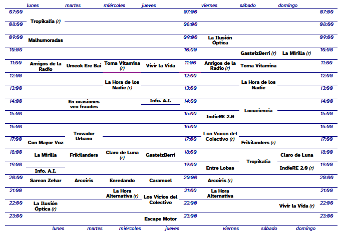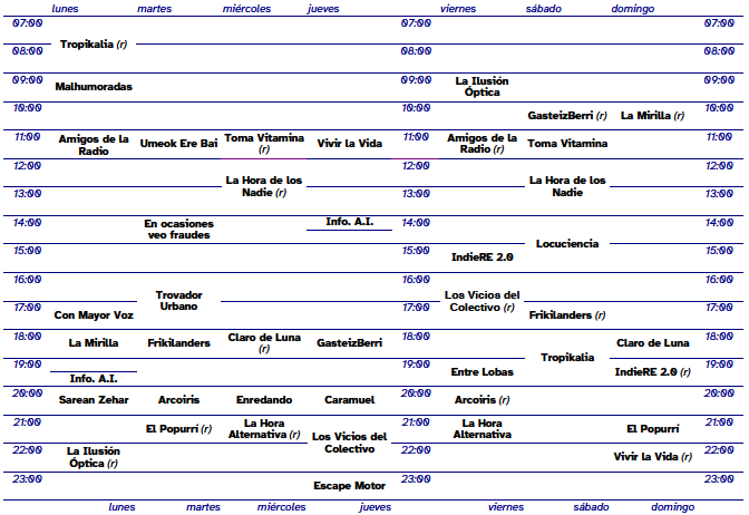 Parrilla de programación Nuestros programas en antena: Programas de otras emisoras comunitarias: > Nuestros programas antiguos: A tablazos!!